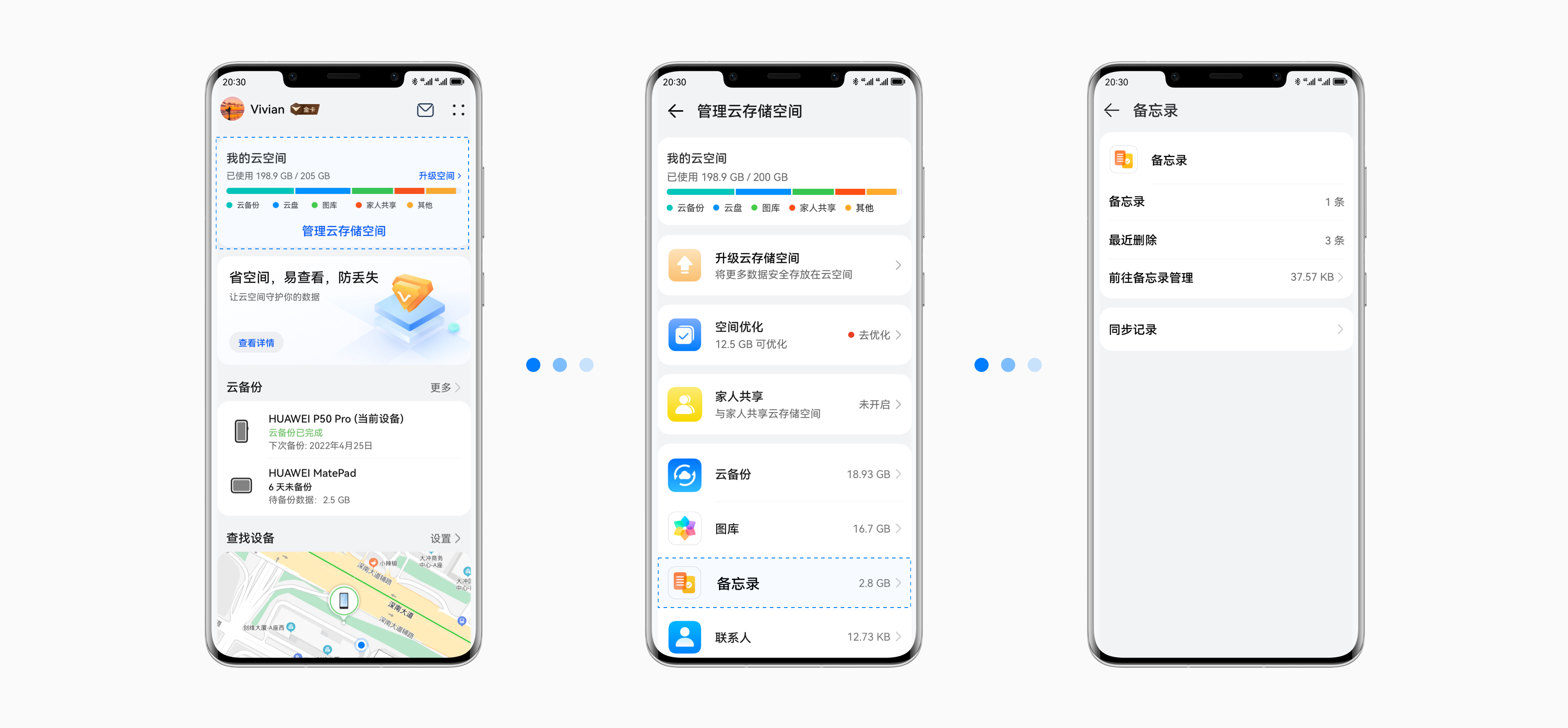在华为设备上使用 后,设备上的备忘录数据会上传至云端,并同步下载到其他华为设备上。您所做的任何更改会在所有设备上保持同步更新,即当您使用设备上的“备忘录”应用或访问cloud.huawei.com的“备忘录”进行新增、修改等操作时,您可以在其他开启备忘录同步开关的华为设备上看到最新的操作结果。例如,您在Mate 20手机上,使用“备忘录”应用创建了一条新的待办来提醒您第二天的工作安排,您会发现这条新增的备忘录会立即显示在您的其他华为设备上。 删除备忘录 开启备忘录同步开关后,您在任意一台设备上对备忘录所做的更改都会同步更新至其他设备。当您在某台设备上删除备忘录时,这些数据也会在其他设备上被同步删除。 EMUI 9.1及以上版本 新增了“最近删除”功能,删除的备忘录数据可以在删除后30天内通过“最近删除”恢复。选择“笔记”或“待办”页签,点击页面左上角的,在弹出的抽屉中可以看到“最近删除”入口。 EMUI 9.1以下版本 不支持“最近删除”,删除的数据无法恢复,请谨慎操作。 查看云端数据 前往“设置”>“云空间”>“管理云存储空间”>“备忘录”,在该页面您可以查看到存储在云端的全部备忘录信息,包括数据大小、备忘录总数。您还可以查看“备忘录”最近30天的同步记录,包括在cloud.huawei.com和各个设备上发生的操作,记录的操作类型包括:新增、移动至“最近删除”、从“最近删除”恢复,所有的操作都是按天统计,并会根据网页和设备名称分别统计和展示。