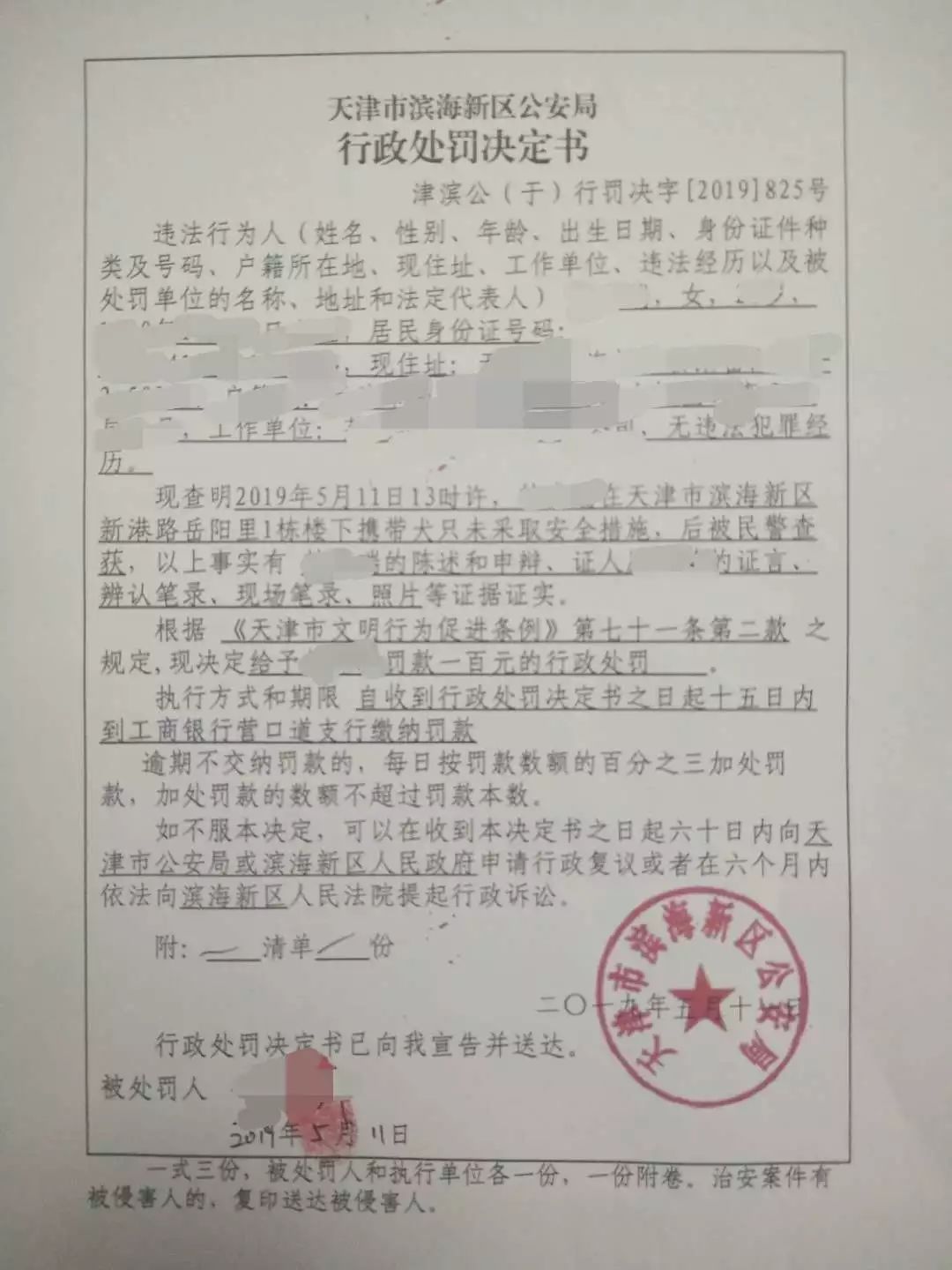 今天,记者从滨海新区公安局获悉,一市民因外出溜犬未采取牵引绳安全措施被于家堡派出所给予罚款100元的行政处罚,这是《天津市文明行为促进条例》施行以来,滨海新区公安局开出的首例不文明养犬罚单。