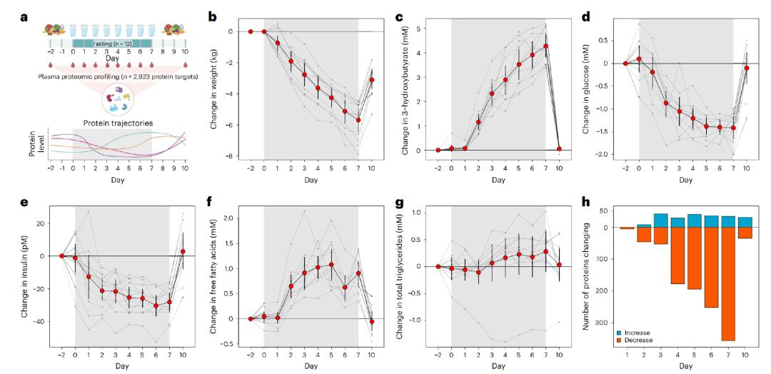 在整个7天禁食期间,研究者还密切监视了参与者的健康数据——在禁食之前、期间和之后,研究者记录下血浆蛋白质组中约3000种蛋白水平的变化,探究禁食可能给健康带来的影响。