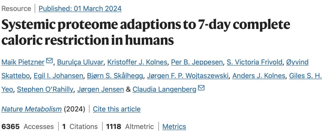 [1]Pietzner M, Uluvar B, Kolnes KJ, Jeppesen PB, Frivold SV, Skattebo Ø, Johansen EI, Skålhegg BS, Wojtaszewski JFP, Kolnes AJ, Yeo GSH, O'Rahilly S, Jensen J, Langenberg C. Systemic proteome adaptions to 7-day complete caloric restriction in humans. Nat Metab. 2024 Mar 1. doi: 10.1038/s42255-024-01008-9. Epub ahead of print. PMID: 38429390.