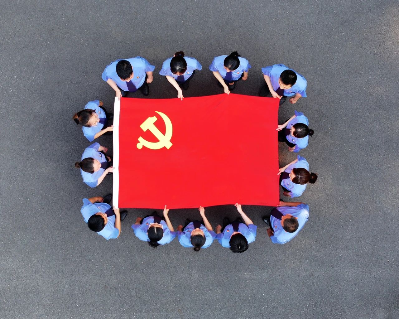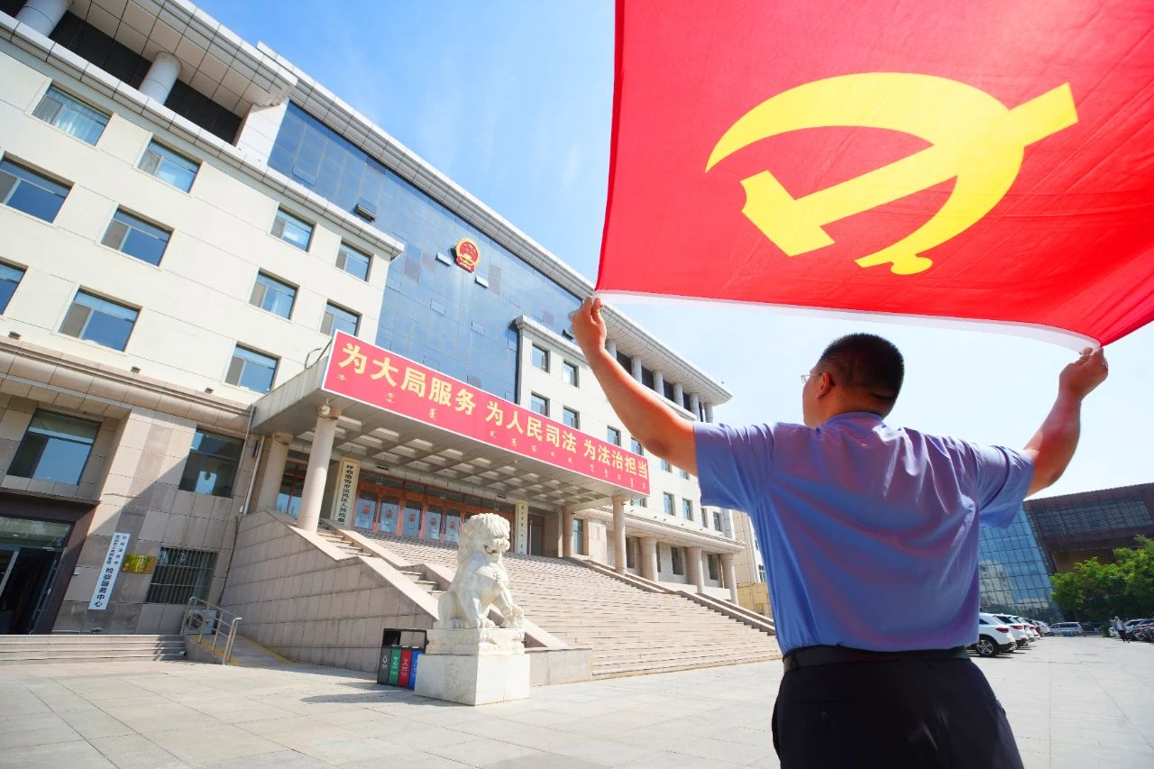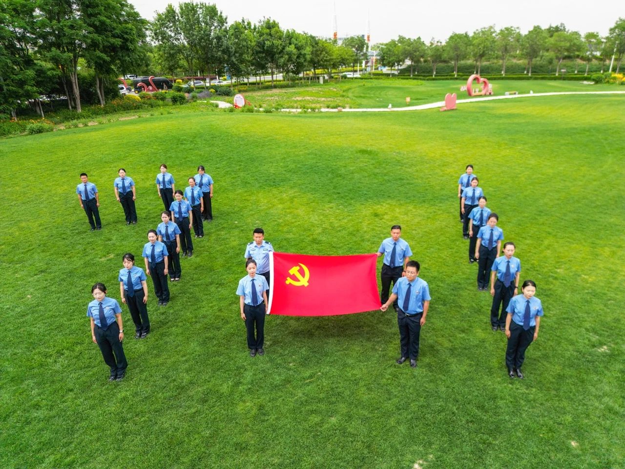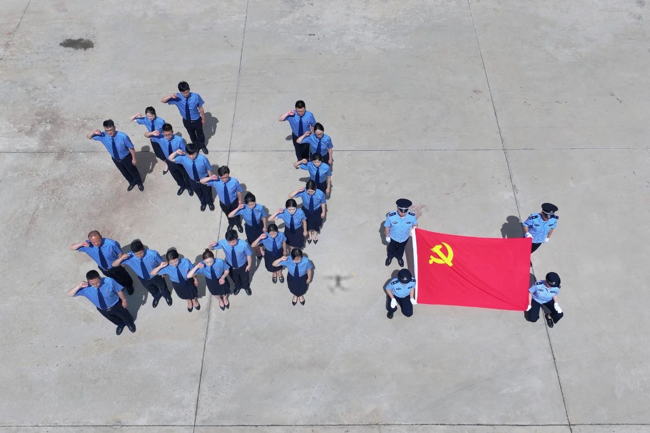 “七一”前夕,河南省鹤壁市淇滨区检察院干警身着制服,围绕党旗,以坚定姿态展现责任与担当。摄影 李卓雅 张文婷