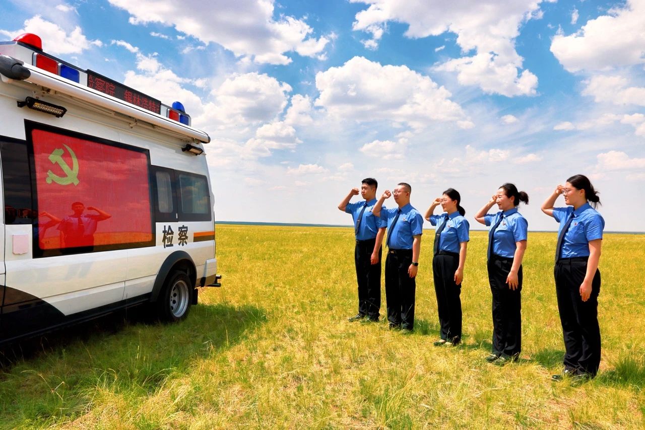 “七一”前夕,内蒙古自治区锡林浩特市检察院检察人员在盛夏的草原之上开展主题党日活动,检察人员面对党旗庄严宣誓,骄阳之下,尽显赤子之心。摄影 王中丹