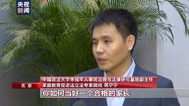 中国政法大学未成年人事务治理与法律研究基地副主任家庭教育促进法立法顾问 苑宁宁:第一个关键词就是指引,通过法律的方式告诉父母,你如何当好一个合格的家长,引导着你去按照科学的方法,科学的理念去教育孩子。第二个关键词是赋能,就是的确父母也是需要一个不断学习的过程,遇到困难和问题的时候,可以去向公共体系获取相应的帮助,也学习到相关的知识,然后来提升自己的能力。