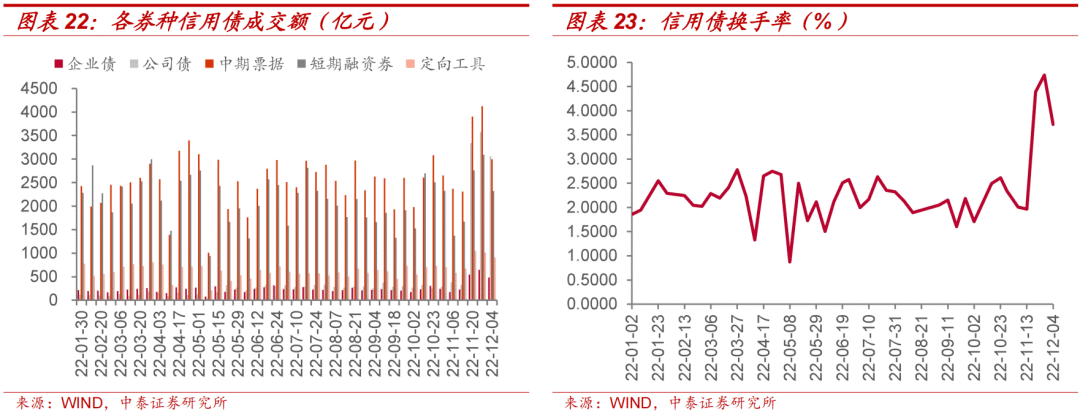 本周信用债市场成交活跃度有所下降。本周信用债周度换手率为3.72%,较上周下行102个bp。分券种看,企业债、公司债、中期票据、短期融资券和定向工具成交量分别为481.67亿元、3057.70亿元、2995.19亿元、2319.76亿元和910.09亿元,企业债、公司债、中期票据、短期融资券和定向工具成交量较上周均有不同程度下降。