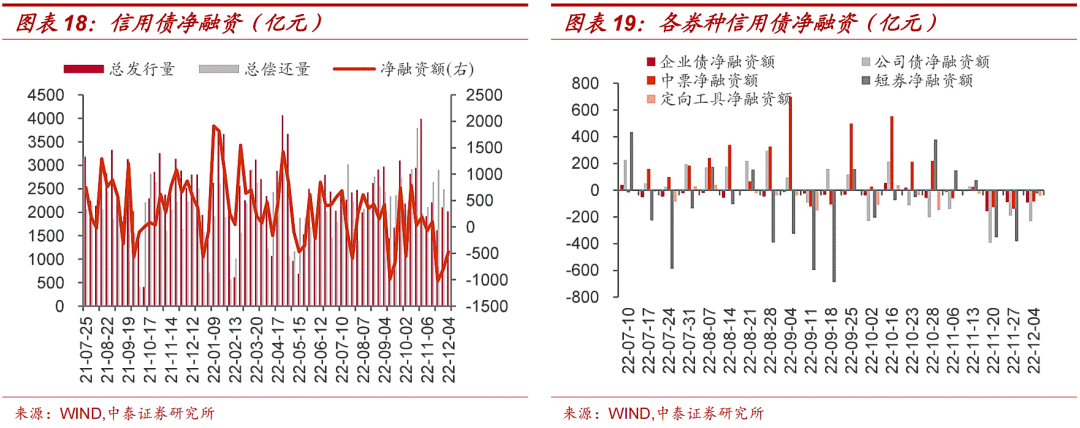 具体来看,企业债、公司债、中期票据、短期融资券及定向工具净融资额分别为-91.86亿元、-232.19亿元、-84.38亿元、-24.27亿元和-40.8亿元。本周各券种信用债净融资规模持续为负,其中,企业债、公司债和定向工具净流出规模有所上升,中期票据和短期融资券净流出规模有所下降。