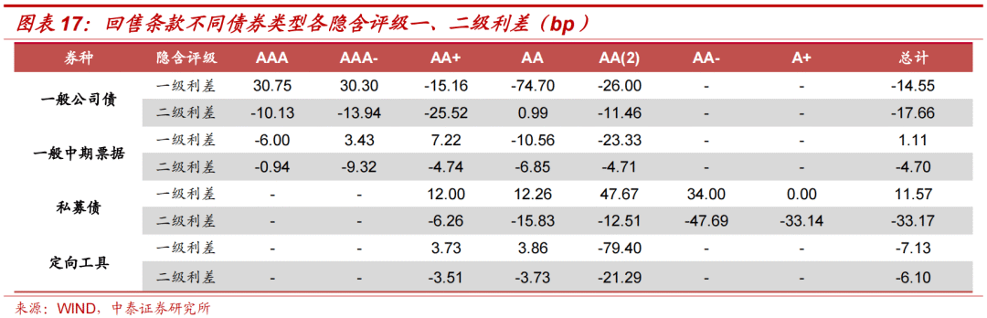 对于回售条款,我们以求各隐含评级平均数的方法进行分析,分散单个债券组合可能出现的误差。一级利差大多为负,这支持了回售条款对投资者有利的判断。分隐含评级看,隐含评级相对较低的AA与AA(2)基本都为负。无论是整体上还是分评级分债券类型,二级利差基本为负。