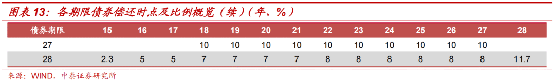 从偿还时点与比例来看,各类期限债券提前偿还时点及对应偿还比例具有一般性规律。例如,5年期债券的提前还本条款一般将还款时点设置在债券存续期的第3、4、5年末,且对应的偿还比例一般为30%、30%、40%;7年期债券的提前还本条款一般将还款时点设置在债券存续期的第3、4、5、6、7年末,且每年末对应的偿还比例一般都为20%。