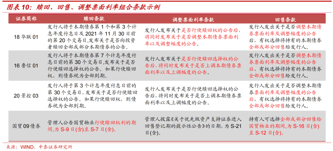 一般而言,赎回权多数情况下会优先于回售权,但也有特例。以证监会主管ABS“国贸09”为例,其行使赎回选择权和调整票面利率的公告并不在同一天公布,且行使回售权的期间优先于赎回权。