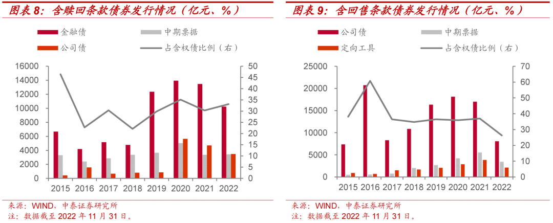 我们选取2015年至今的数据,观察含权债的发展情况和占全部信用债的比例,并区分了是否含选择性条款的债券进行分析。从含权债发行规模来看,含权债发行规模自2017年起不断上升,2021年开始有所回落。其中,含选择性条款的债券占全部含权债比例虽一直保持下降态势,但占比始终超过50%。从含权债占发行总量比重来看,含权债占信用债与金融债总发行量比重从2015年起稳步上升,至2019年开始有所回落,近年出现小幅上升。