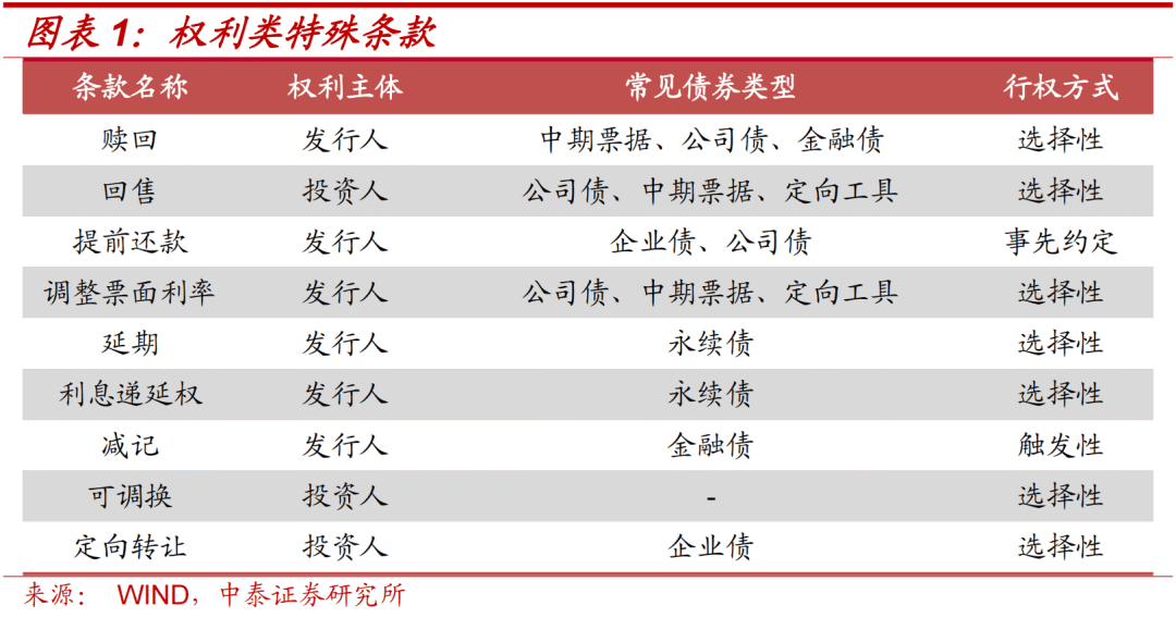 权利类条款包含发行人权利和投资人权利两种,发行人权利有赎回、提前还款、调整票面利率、延期、利息递延权、减记等。投资人权利有回售、可调换、定向转让等。总体来看,权利类条款大多数为选择性权利,即权利主体在事先约定此类条款的基础上,后续在关键时点再选择是否行权。仅有提前还款为事先约定而不作行权与否的再选择,减记则是在触发重大事项时发行人才能够行权。