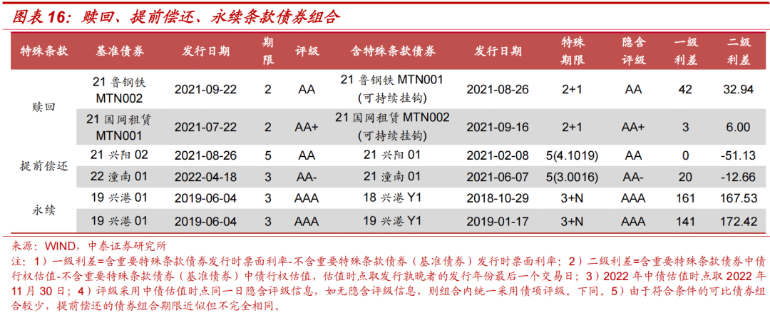 由于赎回、提前偿还、永续条款三者得到的债券组合过少,以枚举各债券组合的方式进行分析。
