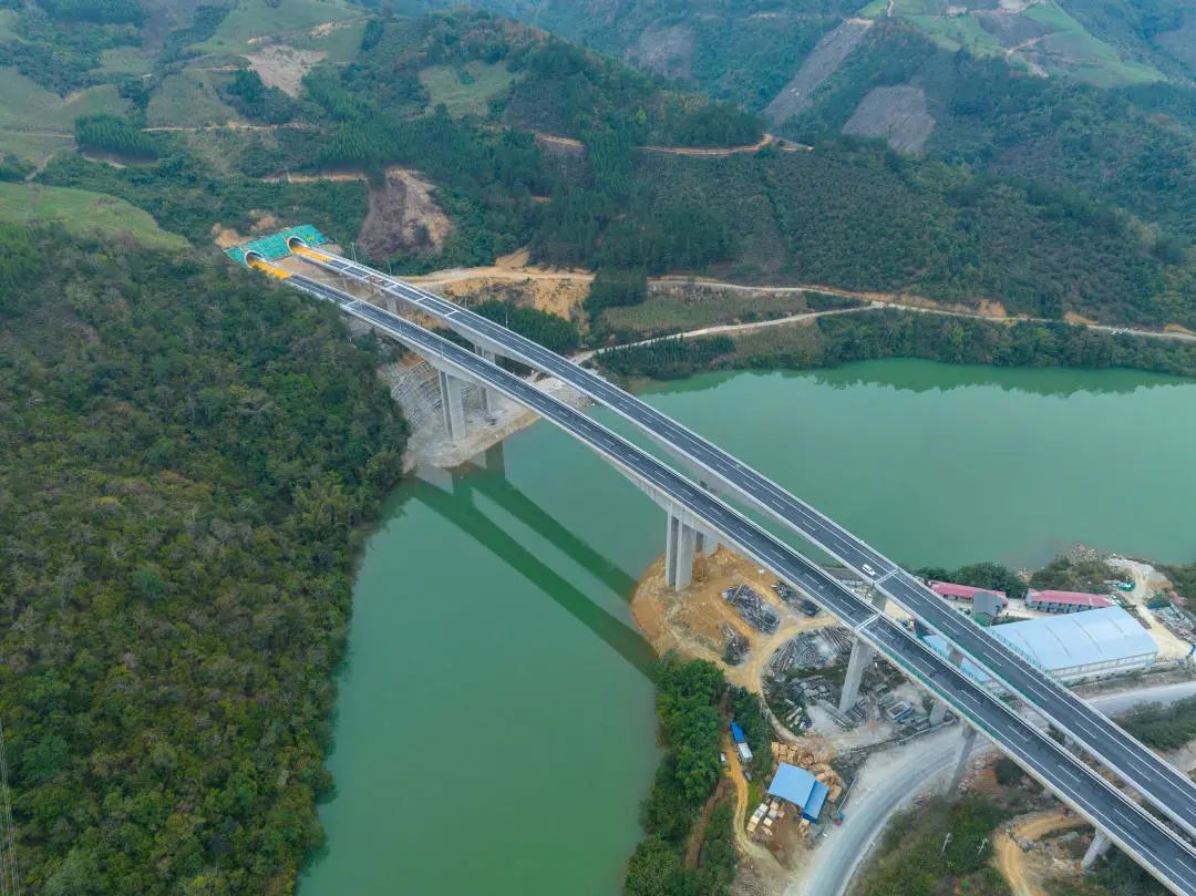 据了解,南丹至天峨高速公路项目起于河池市南丹县八圩瑶族乡关西村,终点位于河池市天峨县下老乡弄塘屯,全长约104.9公里,于2018年12月开工建设。该项目是一项“绿色环保、智慧建造、科技创新、交旅融合”的品质绿色双示范工程,先后获得了广西钢结构奖、广西绿色工地、中国公路学会微创新金奖等荣誉称号。项目建设有世界最大跨径拱桥——主跨达600米的天峨龙滩特大桥和广西在建高速公路最长隧道——6.3公里的燕来隧道。项目拉所2号主桥上部结构采用2×92米单箱双室连续钢箱梁结构,为全国山区高速公路同类型桥梁中单跨跨径最大,在广西乃至全国同类型桥梁施工中首次成果应用了钢箱梁步履式顶推加横移工艺,标志着项目桥梁技术应用取得新突破。
