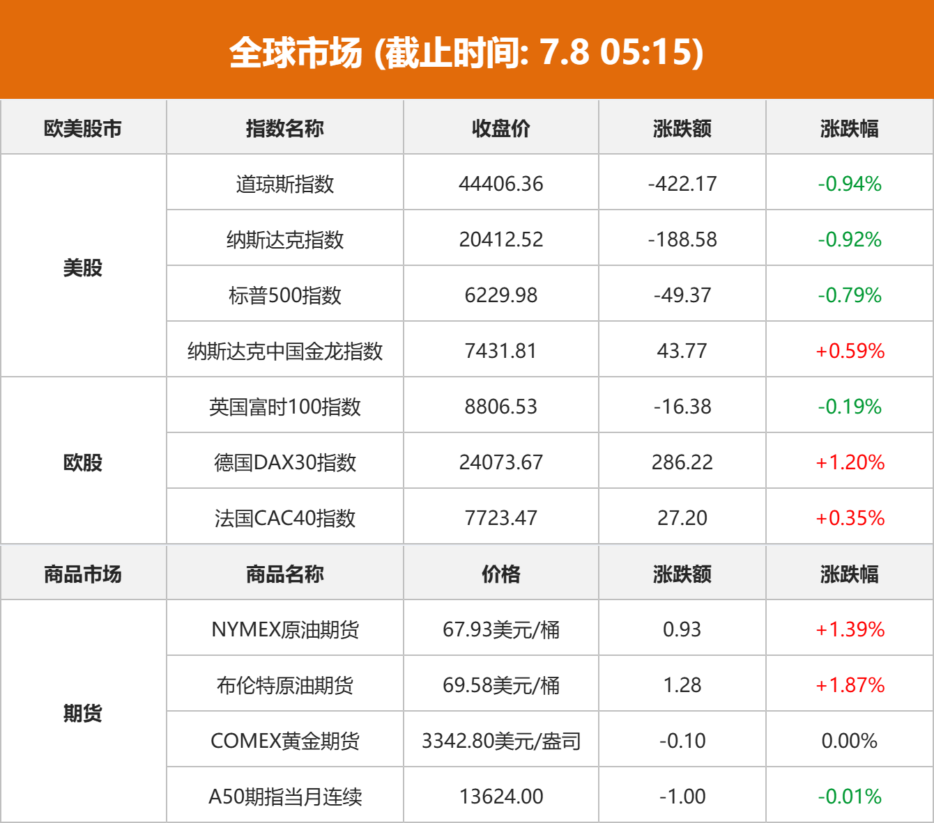 美股市场:美股三大指数07月07日收盘全线下跌。截至收盘,道琼斯工业平均指数比前一交易日下跌422.17点,收于44406.36点,跌幅为0.94%;标准普尔500种股票指数下跌49.37点,收于6229.98点,跌幅为0.79%;纳斯达克综合指数下跌188.58点,收于20412.52点,跌幅为0.92%。