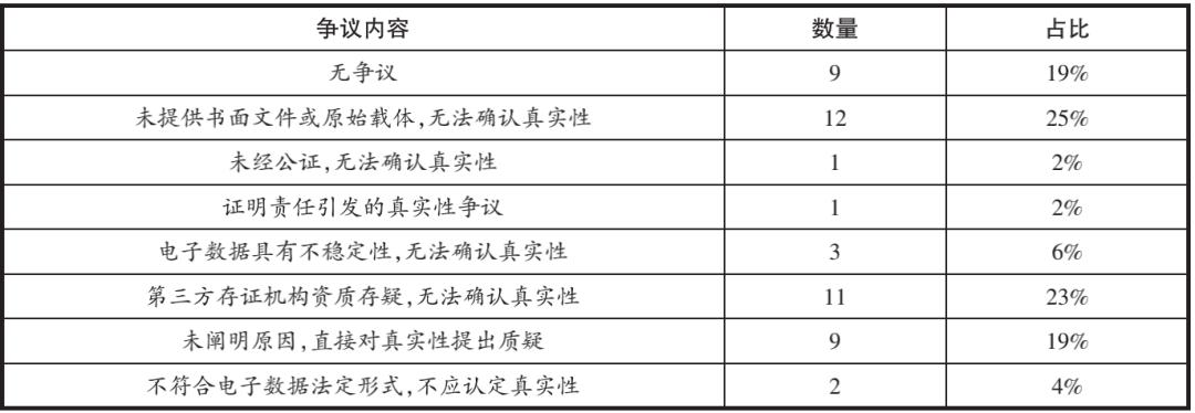 随着信息化建设的推进,人们的行为方式逐步从“线下”向“线上”转变,在不同领域的诉讼活动中出现了大量的电子数据证据。国内目前尚无学者针对电子数据真实性进行实证研究,但目前电子数据发展势头正盛,不仅成为法定证据类型之一,而且越来越多地成为民事诉讼中与事实认定有关的重要证据。笔者以“电子数据”“民事诉讼”以及“判决书”作为检索项,收集“北大法宝”“北大法意”和“最高人民法院裁判文书网”2019年以来的相关案例,排除了金融借款合同中有关效力格式条款的结果以及三个数据库之间重合收录的案例后,得到了48个案例并进行全面梳理与分析。由于电子数据易被篡改、稳定性弱的特点,其真实性常成为民事诉讼中争论的焦点。从下表可看到司法实务对电子数据真实性的争议概况。(见表1)