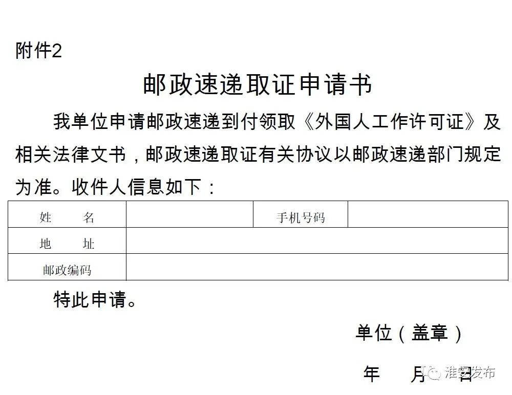 (4)办理许可通知业务的,申请单位可通过“外国人来华工作许可管理服务系统”自行下载许可通知书;办理工作许可证业务的,申请单位可申请邮政速递到付方式领取《外国人工作许可证》,确需前往受理机构现场办理的,应电话预约办理,并按疫情防控工作要求佩戴口罩,避免人员聚集。办理注销业务的,申请单位须将外国人工作许可证寄回(寄回地址:淮安市清江浦区大治西路18号市科技局307室,电话:83666591);