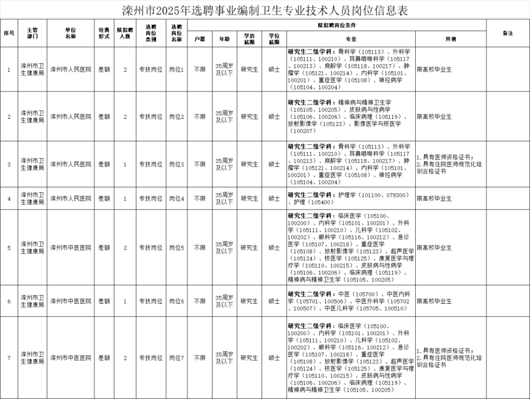 7.具备岗位所需要的其他条件。具体条件按《滦州市2025年选聘事业编制卫生专业技术人员岗位信息表》(附件1)要求确定。