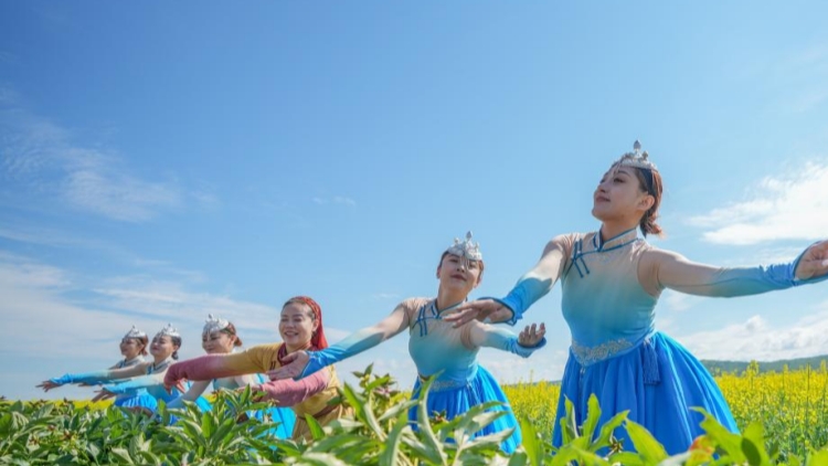 7月12日,演员在内蒙古呼伦贝尔市额尔古纳市蒙兀室韦苏木奥洛契庄园的油菜花海中表演节目。