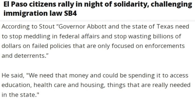 埃尔帕索市警长斯托特也认为,阿博特州长和得州政府应停止干涉联邦事务,“不要在只注重执法和威慑的失败政策上浪费数十亿美元”。