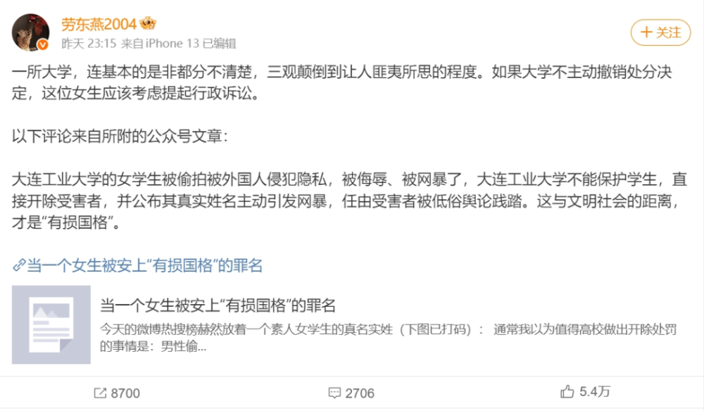 事后,大连工业大学决定拟开除该女生,并在公告中公开了其真实姓名,其中很重要的一项处分依据,便是开头那句话。依照校方的逻辑,女生的行为至少是“有损国格”的。