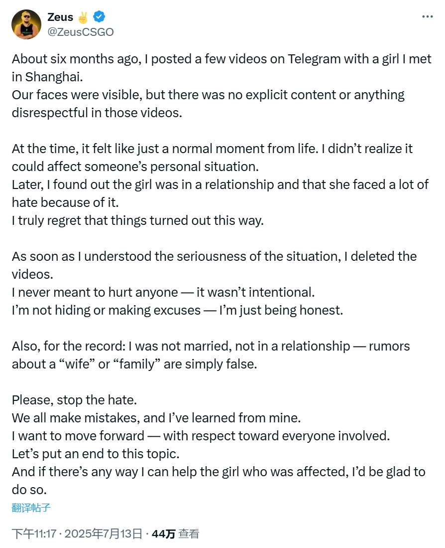 “请停止仇恨。谁都会犯错,这次我也长了教训。这事儿就让它过去吧,希望大家都能互相尊重。如果我能为那个受影响的女孩做点什么,我一定尽力。”Zeus表示。