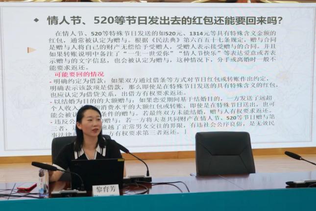 在婚姻家庭法律问题的讲解环节,黎育芳紧密结合现实生活中可能遭遇的复杂情况,通过列举“丈夫婚前隐瞒患有艾滋妻子欲离婚”等鲜活案例,以通俗易懂的方式,阐释了民法典中关于婚姻效力、夫妻共同财产、个人财产界定、离婚损害赔偿等与婚姻家庭息息相关的法律条款。这种将抽象法律条文具象化的讲解方式,不仅让晦涩的法律知识变得易于理解,更引发了参与活动者的热烈讨论。