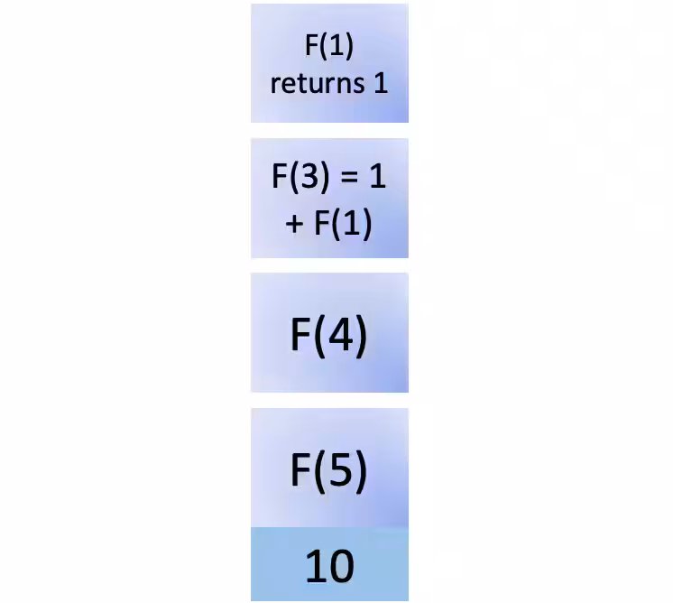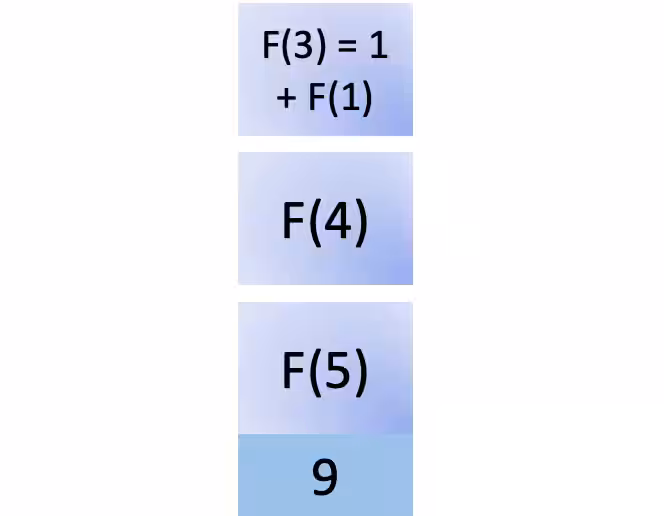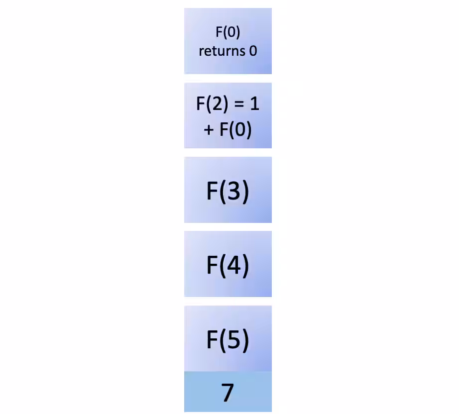 Jetzt hat F(5) alle Werte, die es zur Berechnung seines eigenen Wertes benötigt. Sie erhalten 5, indem Sie 3 und 2 addieren, und das ist der letzte Schritt, bevor Sie den F(5)-Aufruf vom Stapel nehmen. Diese Aktion beendet Ihre Folge rekursiver Funktionsaufrufe: