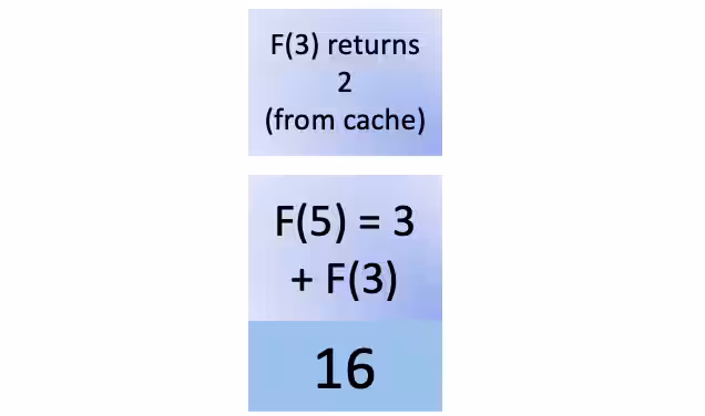F(5) hat nun das Ergebnis von F(4) und auch das Ergebnis von F(3). Sie schieben einen F(3)-Aufruf auf den Stapel und der raffinierte Cache kommt wieder ins Spiel. Sie haben zuvor F(3) berechnet, Sie müssen es also nur noch aus dem Cache abrufen. Es gibt keinen rekursiven Prozess zur Berechnung von F(3). Es gibt 2 zurück und Sie entfernen F(3) vom Stapel: