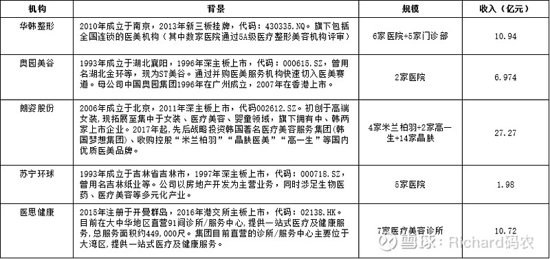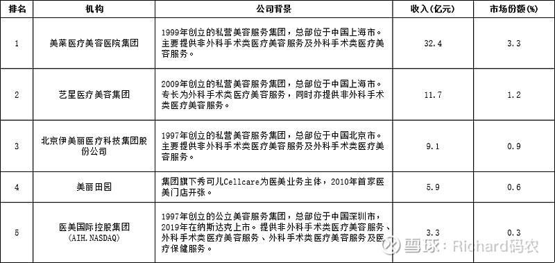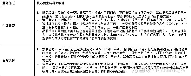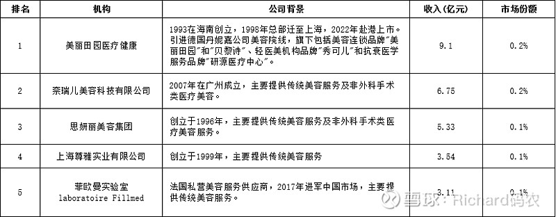 龙头企业和商业模式生活美容和医疗美容同属美容行业,但是二者的监管力度、商业模式差别很大,一般单独分析各自赛道的头部玩家。生美头部玩家包括美丽田园、奈瑞儿、思妍丽、上海尊雅(丽妍雅集Rubis SPA)、菲欧曼等,医美头部玩家有华韩整形、朗姿股份、苏宁环球、美丽田园等,医美O2O平台有新氧、更美、悦美等。