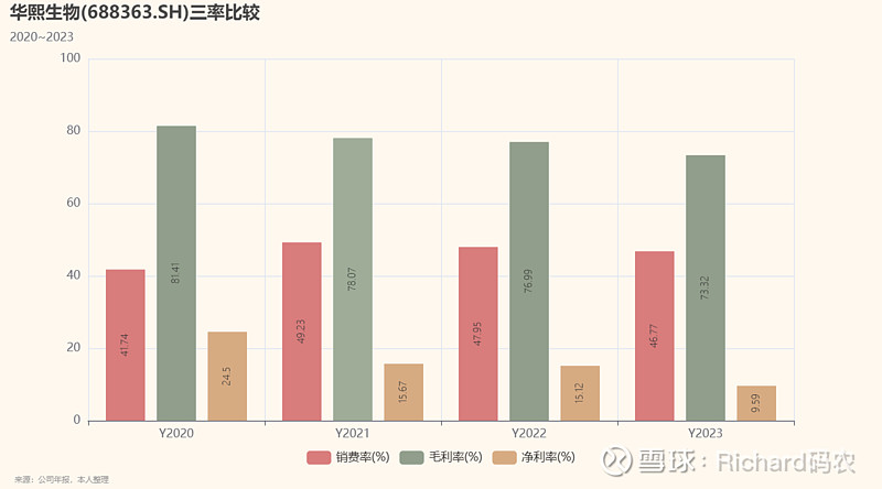 过去四年,华熙生物毛利率在73%~81%之间,净利率在9.59%~24.5%之间。顺便提一句,华熙生物过去四年毛利率和净利率逐年下降。