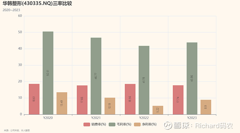 过去四年,华韩整形毛利率在41.78%~50.51%之间,净利率在5.22%~13.49%之间。