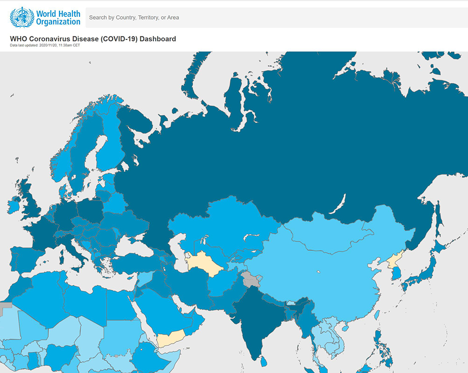 11月20日WHO全球疫情更新面板上,欧亚非局部的7日新增感染人数可视化统计。颜色越深则代表新增病例越多。