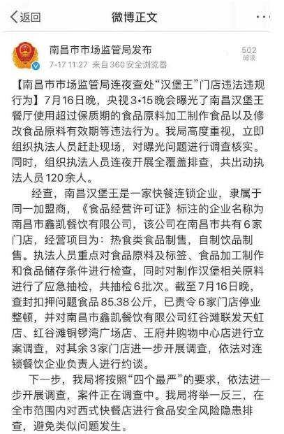 此前消息,7月16日,央视“3·15”晚会曝光了南昌市多家汉堡王门店均存在不按规定使用足量食材、修改食材保质期标签、使用过期变质食材等违规行为。被曝光后,汉堡王中国发布道歉声明,并表示涉事门店系汉堡王的加盟店。