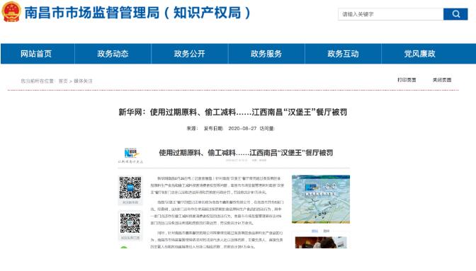 中国人民银行北京营业管理部公布行政处罚的当天,南昌市市场监督管理局发布通报称,针对南昌“汉堡王”餐厅使用超过保质期的食品原料生产食品和偷工减料损害消费者权益等问题,南昌市市场监督管理局对南昌“汉堡王”餐厅6家门店处以没收违法所得和罚款的行政处罚,罚没款共计916504.02元。同时依法对其法定代表人处以顶格罚款,主要负责人、直接负责的主管人员和其他直接责任人员处以相应罚款,罚款合计281万余元。