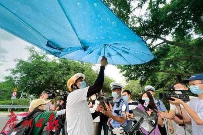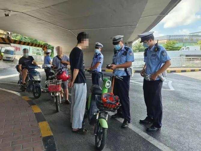 2022年8月19日,在科韵路中山大道立交电动自行车交通违法整治点,经过交警劝导,市民把加装的遮阳伞拆除。