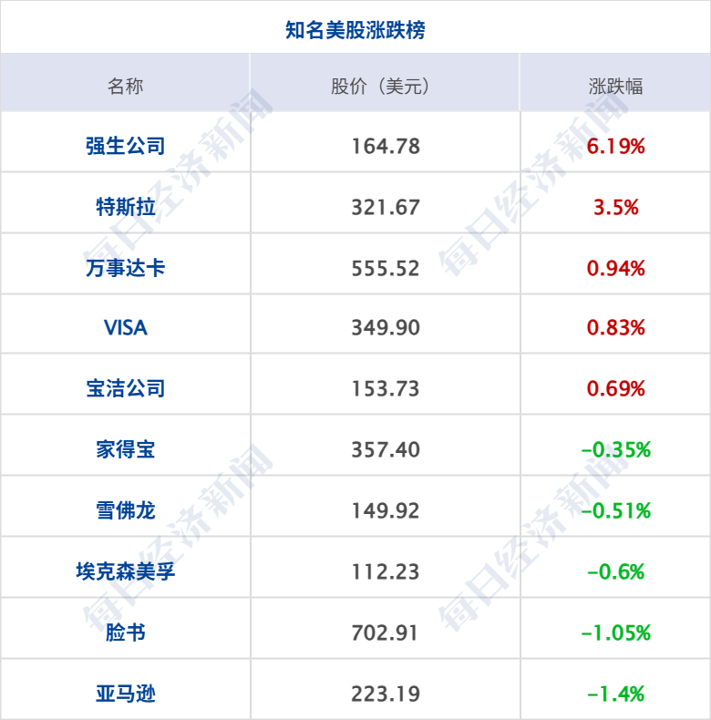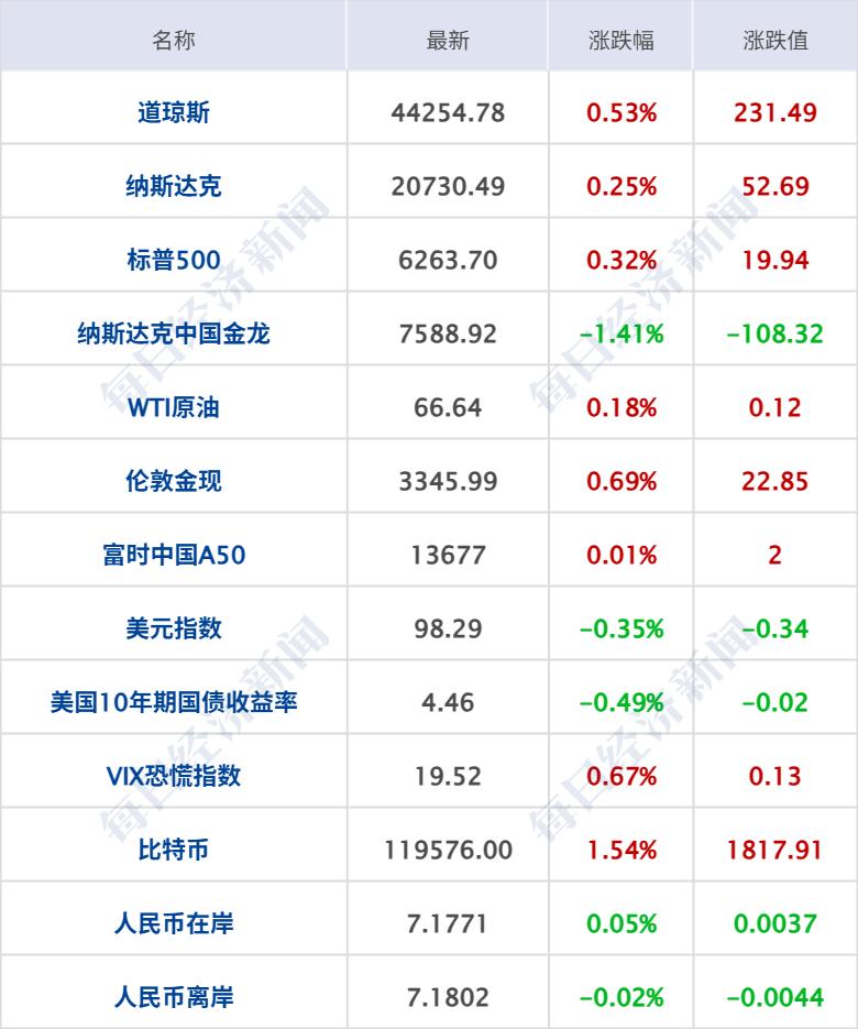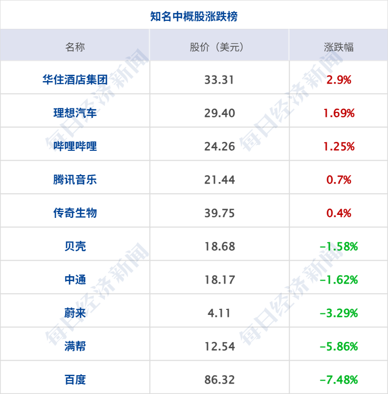 美股三大指数集体收涨,道指涨0.53%,纳指涨0.25%续创收盘新高,标普500指数涨0.32%;芯片股走低,阿斯麦跌超8%;大型科技股涨跌不一,特斯拉涨超3%,谷歌涨0.53%,苹果、英伟达微涨,微软小幅下跌。中概股多数下跌,纳斯达克中国金龙指数跌1.41%,百度跌超7%,老虎证券跌逾4%,京东、阿里巴巴跌超1%,哔哩哔哩涨超1%。