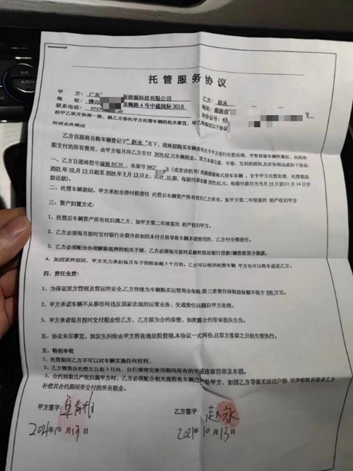 赵永开车来到位于广东省佛山市的“车管部门”办理“托管”手续。托管协议显示,车辆由广东智富卓越新能源科技有限公司托管处理,公司每月给赵永支付租金3000余元。