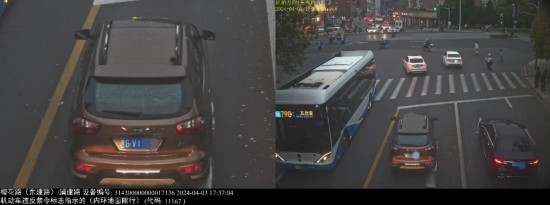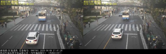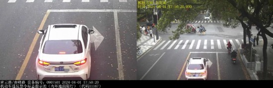 ▲2024年4月9日17時47分,號牌為黑GV1***的小型普通客車在浦建路櫻花路,實施了“機動車違反禁令標志指示的(內環地面限行)”違法行為。