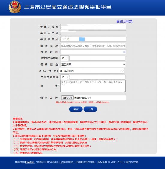 輸入網址 即可進入“上海市公安局交通違法視頻舉報平台”。推薦使用Chrome谷歌瀏覽器,經測試獵豹、歐朋(Opera)也可以正常使用。此外,在極速模式下,360、QQ、UC、搜狗、遨游、百度等瀏覽器也可以使用。