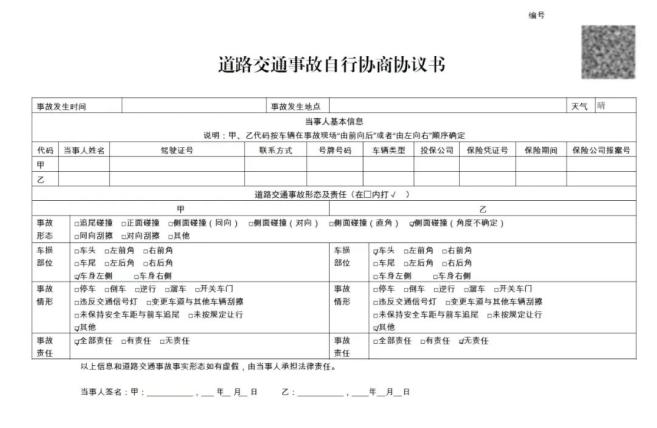 《道路交通事故处理程序规定》第21条规定:“当事人自行协商达成协议的,制作道路交通事故自行协商协议书,并共同签名。道路交通事故自行协商协议书应当载明事故发生的时间、地点、天气、当事人姓名、驾驶证号或者身份证号、联系方式、机动车种类和号牌号码、保险公司、保险凭证号、事故形态、碰撞部位、当事人的责任等内容。”