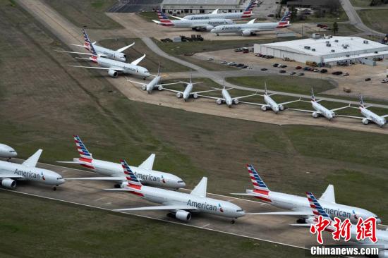 当地时间3月23日,为应对新型冠状病毒的传播,航班减少,在美国俄克拉荷马州塔尔萨的塔尔萨国际机场的跑道上停满了飞机。
