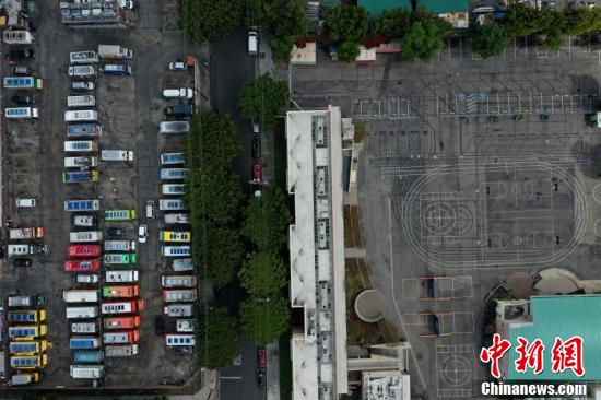 当地时间3月23日,美国加利福尼亚州洛杉矶市,食品卡车停在洛杉矶一所空学校旁边的停车场。
