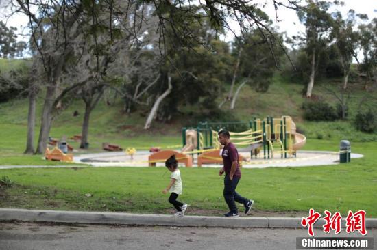 当地时间3月23日,在美国加利福尼亚州发布“居家令”后,一对父母走过一个封闭的游乐场。