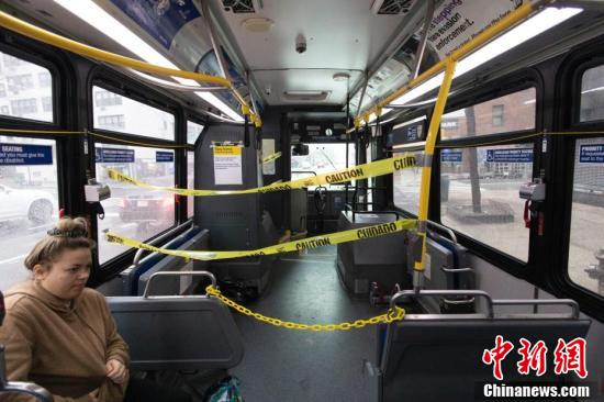 当地时间3月23日,在美国纽约州纽约市一辆公共汽车的车头被贴上隔离胶带,以隔离乘客和司机的距离。
