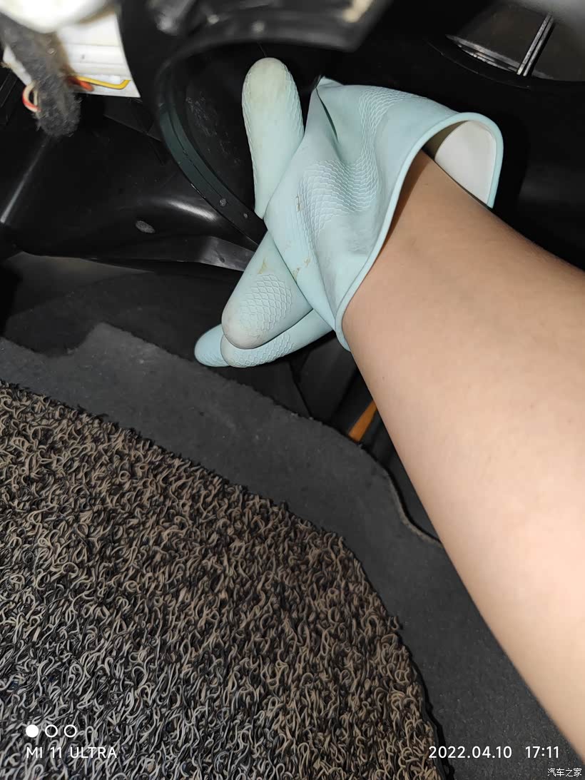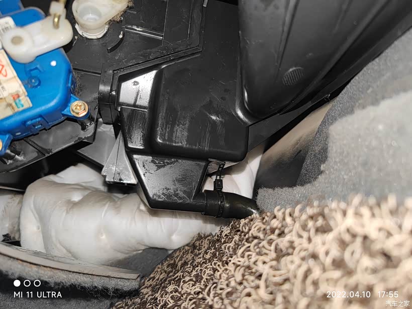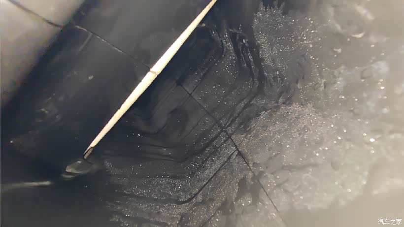 断断续续喷了好几次,中间还进行过一次喷完就立刻关闭空调,然后等一段时间再开空调的操作,这样可以让蒸发箱里的清洗剂能浸泡一段时间,起到较好的清洗效果,不过都是我自己想象的,有没有效无法验证,至少不破坏清洗效果。这是第一步要使清洗剂可以穿透过蒸发箱的操作后地面的痕迹。