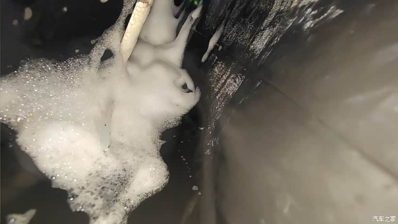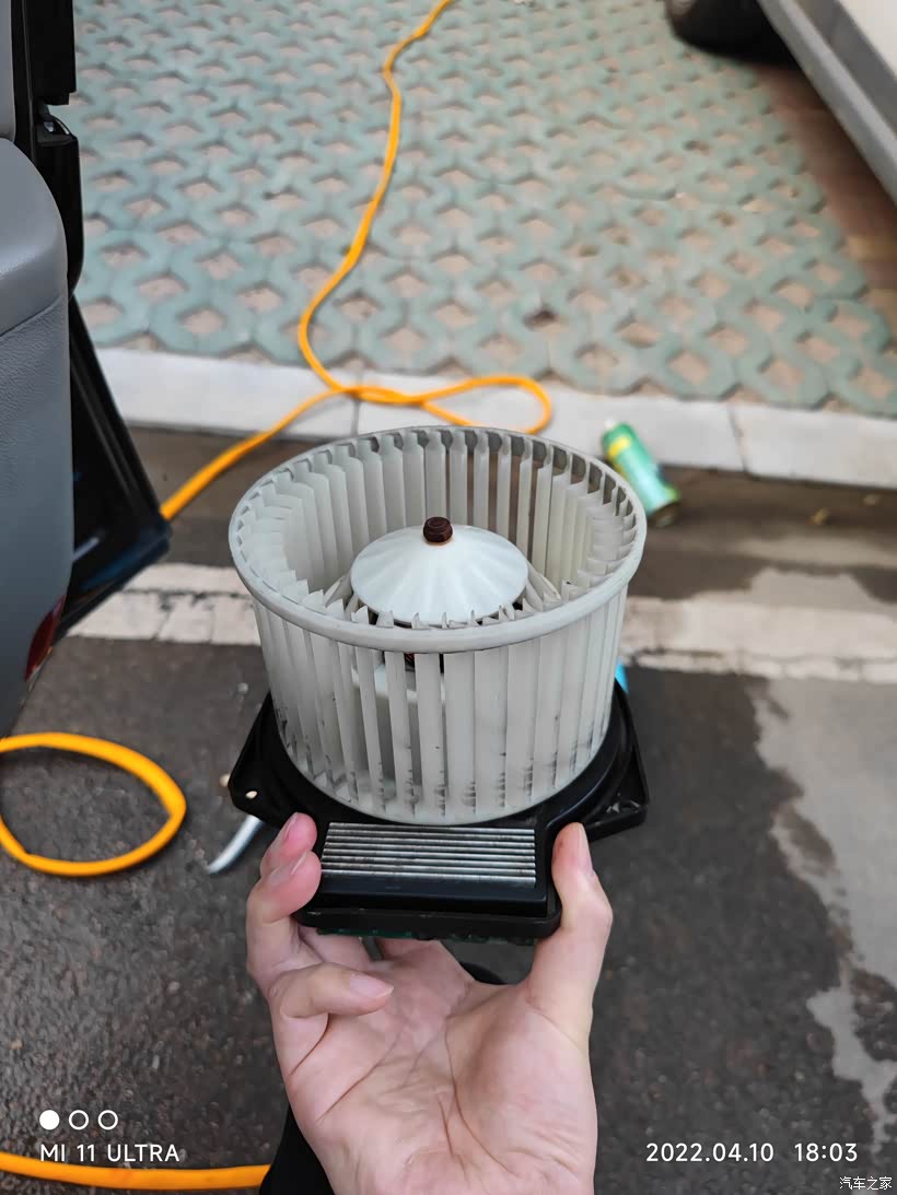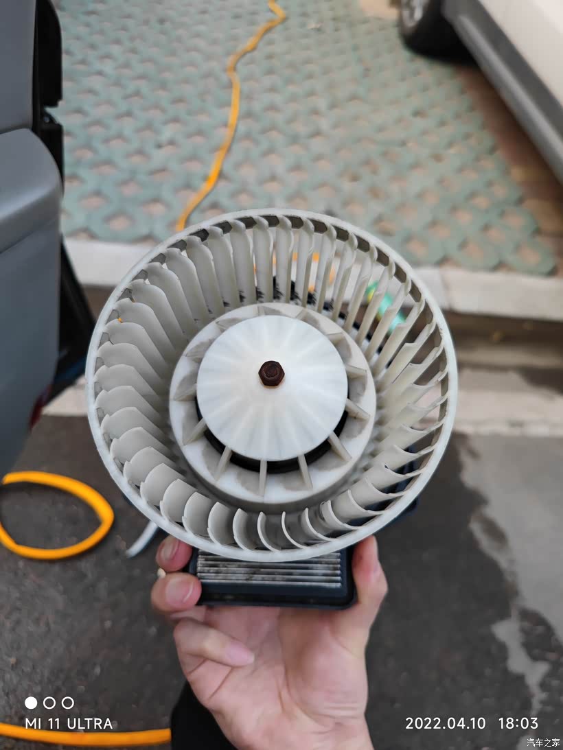 对着鼓风机高速旋转的扇叶喷清洗剂,注意一定不要碰到扇叶,要始终保持足够的安全距离,不然扇叶就会搅碎喷管,还可能损坏扇叶,破坏扇叶的动平衡,造成噪音与抖动变大。一开始我是带着原配的喷头喷的,喷出的是不同方向的四股,那是用来喷风管的,于是拔掉,直接用管子喷。
