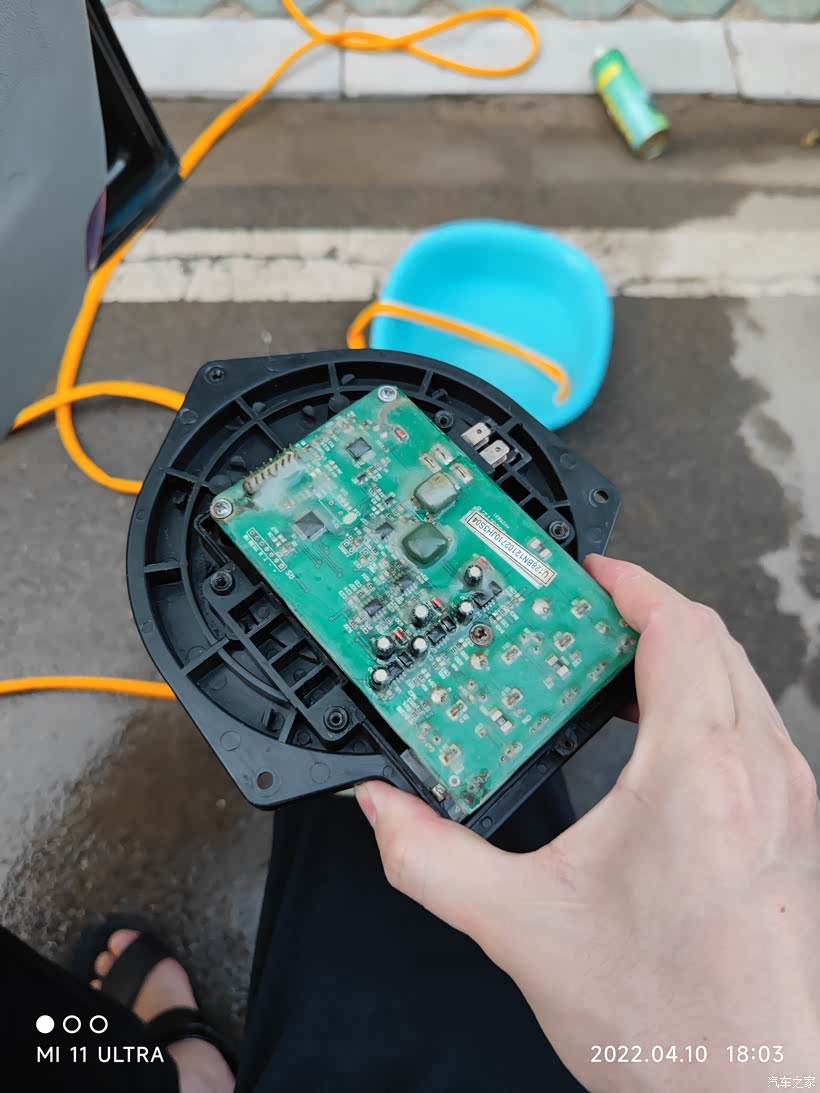 用餐巾纸擦一下后就放在阳光下晾晒,电路板受潮会导致鼓风机不运转,烧毁的概率不大,因为电路板做防水处理了,有一层防水透明胶。