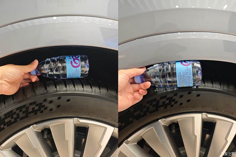通过后备箱一侧按键试了下空悬,第一感觉悬架行程挺大,销售给我说是10cm。我拿矿泉水给大伙试了下,升起最高之后能横放矿泉水,降到最低之后放不下,悬架有【最高、高、标准、高、最高】对应五个悬架高度。