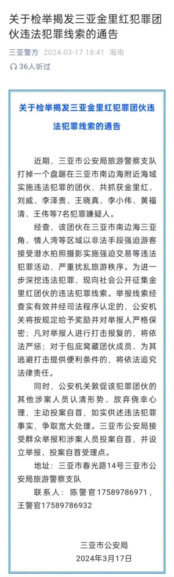 8.潜水时被人取下氧气面罩强迫拍照?警方公开征集线索:日前,海南省三亚市公安局发布通告称,警方近期打掉一个盘踞在三亚市南边海附近海域实施违法犯罪的团伙,该团伙以非法手段强迫游客接受潜水拍照摄影、实施强迫交易等违法犯罪活动,现向社会公开征集该团伙的违法犯罪线索。公告发布后,网友纷纷在社交平台上分享类似经历。据媒体报道,有游客在潜水前曾多次拒绝拍照,但教练在海底把游客的潜水氧气面罩取下或挪开,导致游客呛水。因为担心自己的人身安全,游客只得被迫答应拍照。(光明网)