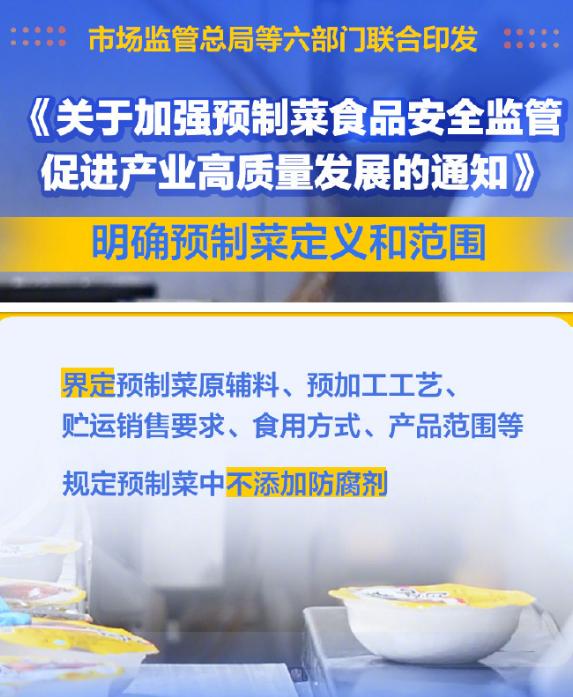 3.六部门发文明确预制菜定义和范围:据国家市场监督管理总局21日消息,市场监管总局等六部门联合印发《关于加强预制菜食品安全监管 促进产业高质量发展的通知》,首次明确预制菜定义和范围。预制菜应当兼具预制化和菜肴的特征,界定预制菜原辅料、预加工工艺、贮运销售要求、食用方式、产品范围等。研究制定预制菜食品安全国家标准,明确规范预制菜食品安全要求,积极营造良好产业发展环境,支持地方推进预制菜产业集聚区建设。其中规定,预制菜中不得添加防腐剂。(法治网)