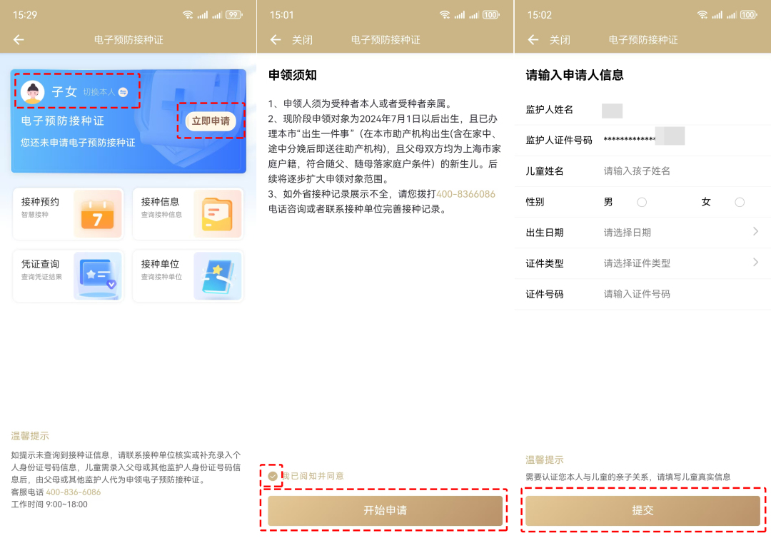 切换到“子女”状态→点击“立即申请”→勾选“我已阅读并同意”并点击“开始申请”→填写孩子信息,并点击“提交”。